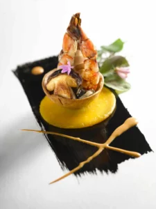 Saint jacques sur une embeurrée de choudou des Landes au galanga, condiment de carotte du jardin de Quentin au Combawa, citron caviar et enoki